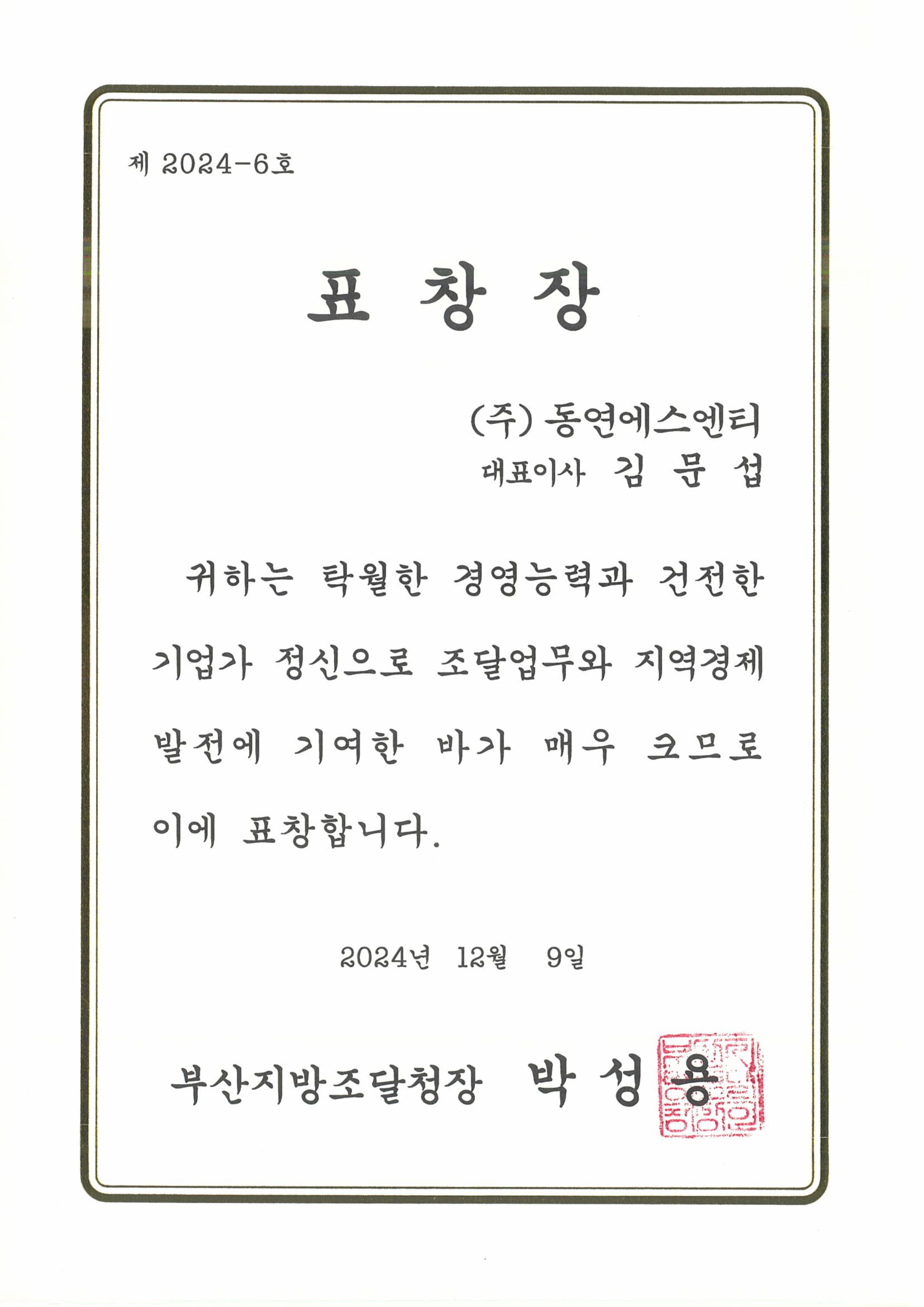 2024년 12월, 동연에스엔티는 부산광역시 조달청장상을 수상했습니다.