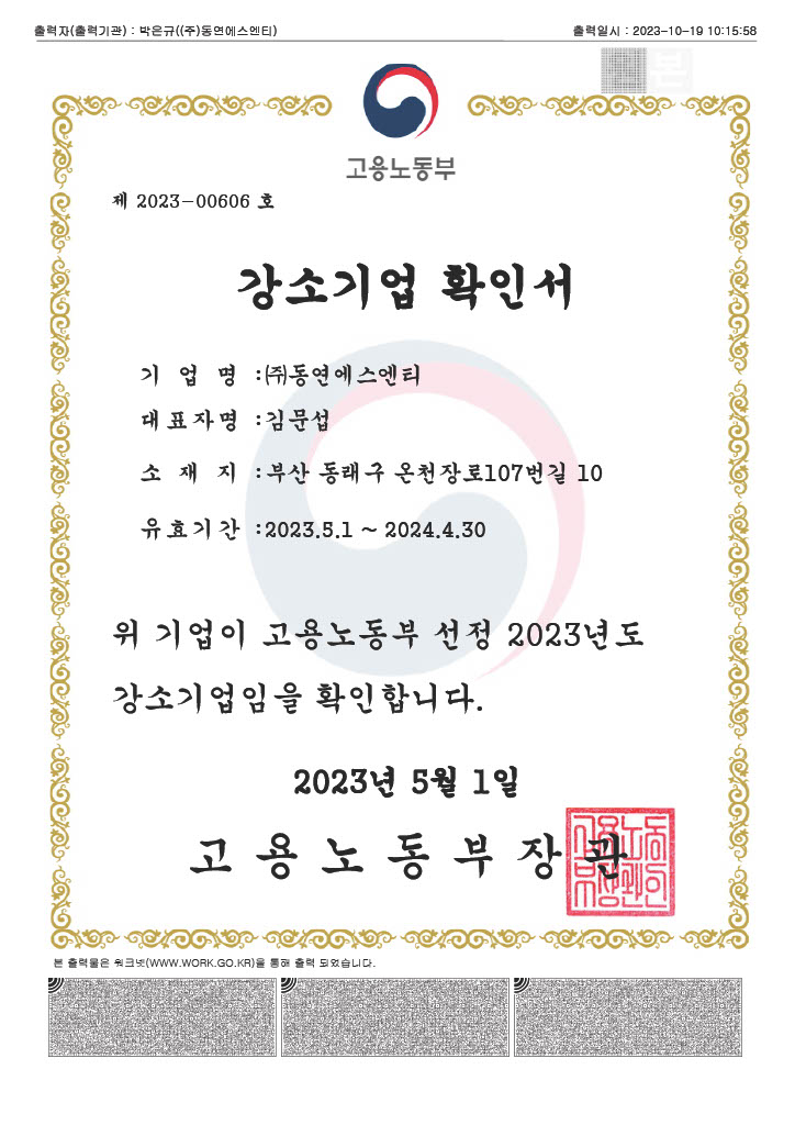 동연에스엔티는 2023년 4월 고용노동부 강소기업으로 선정되었습니다.